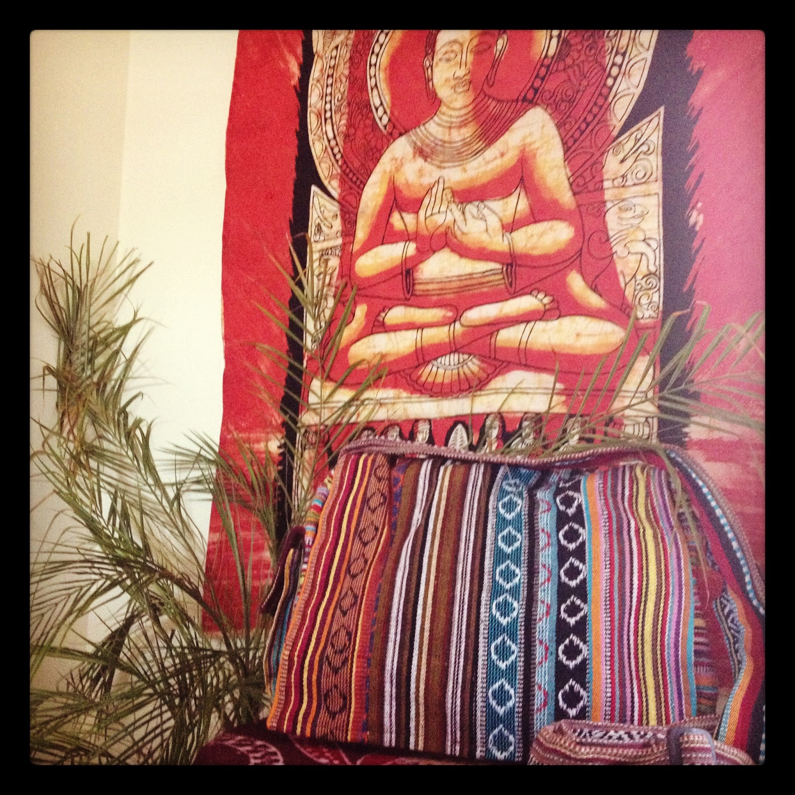 | Our Siesta Briefcase makes the grooviest laptop bag ever...the colorful woven stripes are totally funky and unique. Standard size textbooks and laptops fit in the main pouch and the adjustable strap guarantees the perfect length for everyone. In the background is our Batik Buddha Tapestry. |